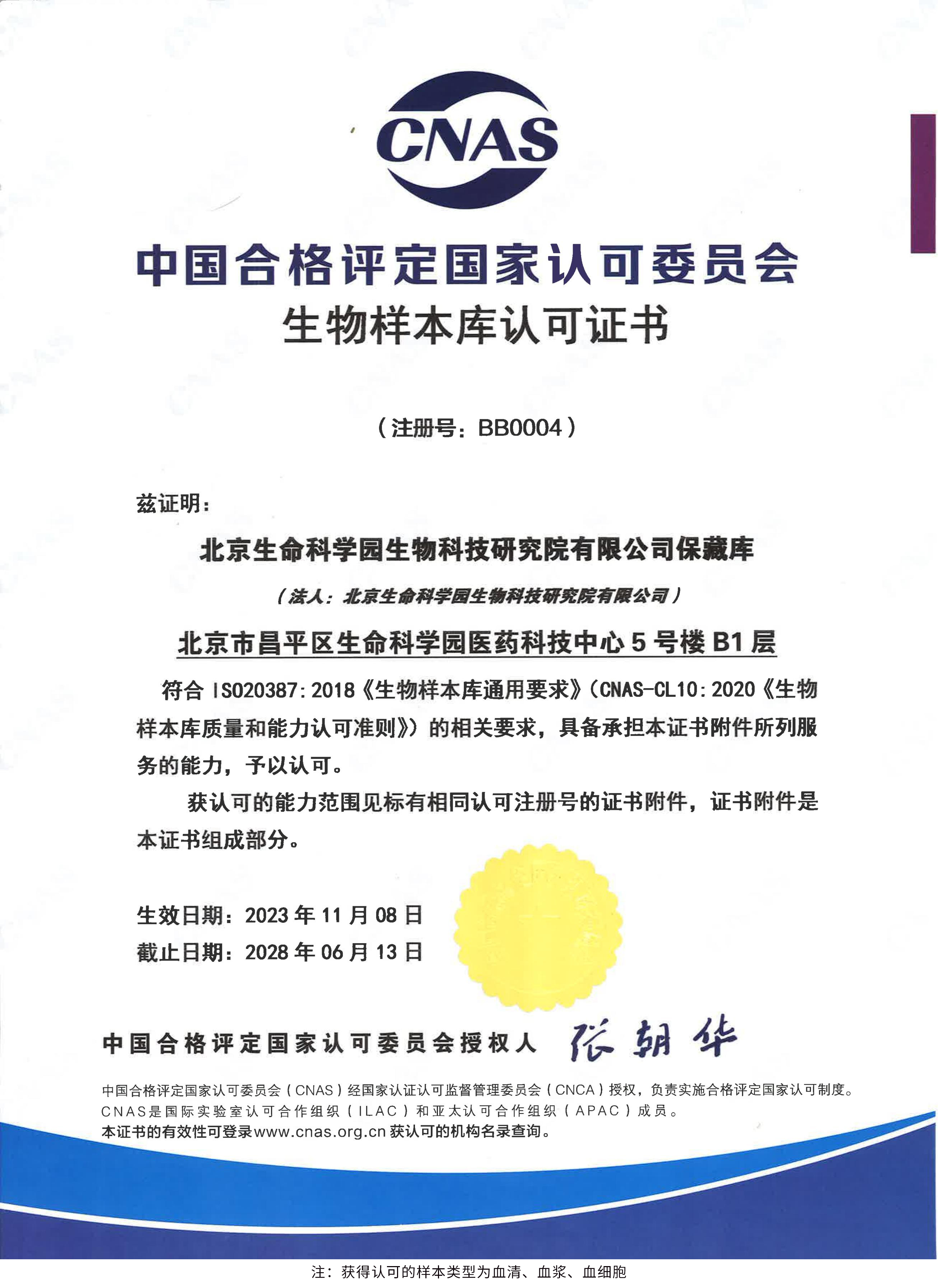 北京生命科學(xué)園生物科技研究院(以下簡稱“北京生物樣本資源庫”)(Biobank of Life Science Park,簡寫“BoLSP”)是一家由北京市科委和中關(guān)村生命科學(xué)園共同支持設(shè)立的第三方生物樣本庫公共服務(wù)平臺,秉承北京重大疾病臨床數(shù)據(jù)和樣本資源庫(以下簡稱“北京庫”)(Beijing Biobank of Clinical Resources,BBCR)十余年的發(fā)展成果,聚合眾多臨床樣本專家的專業(yè)共識,致力于在生命科學(xué)、生物醫(yī)藥研究領(lǐng)域發(fā)揮銜接樣本資源持有者與研究者的橋梁作用,解決生物樣本資源開發(fā)上下游信息不對稱、資源共享困難等問題。研究院在北京中關(guān)村生命科學(xué)園昌平園區(qū)建立了2000㎡生物樣本庫,最大存儲規(guī)模達(dá)1000萬份。研究院遵循CNAS-CL10:2020《生物樣本庫質(zhì)量和能力認(rèn)可準(zhǔn)則》,同時結(jié)合北京庫過去十年的工作經(jīng)驗與教訓(xùn),建立了一套完善的生物樣本保藏質(zhì)量管理體系,從人、機、料、法、環(huán)、控多個角度,實現(xiàn)生物樣本保藏過程的全面質(zhì)量控制,先后獲得國家科技部頒發(fā)的人類遺傳資源保藏行政許可證書和中國合格評定國家認(rèn)可委員會(China National Accreditation Service for Conformity Assessment,CNAS)頒發(fā)的“CNAS認(rèn)可證書”。